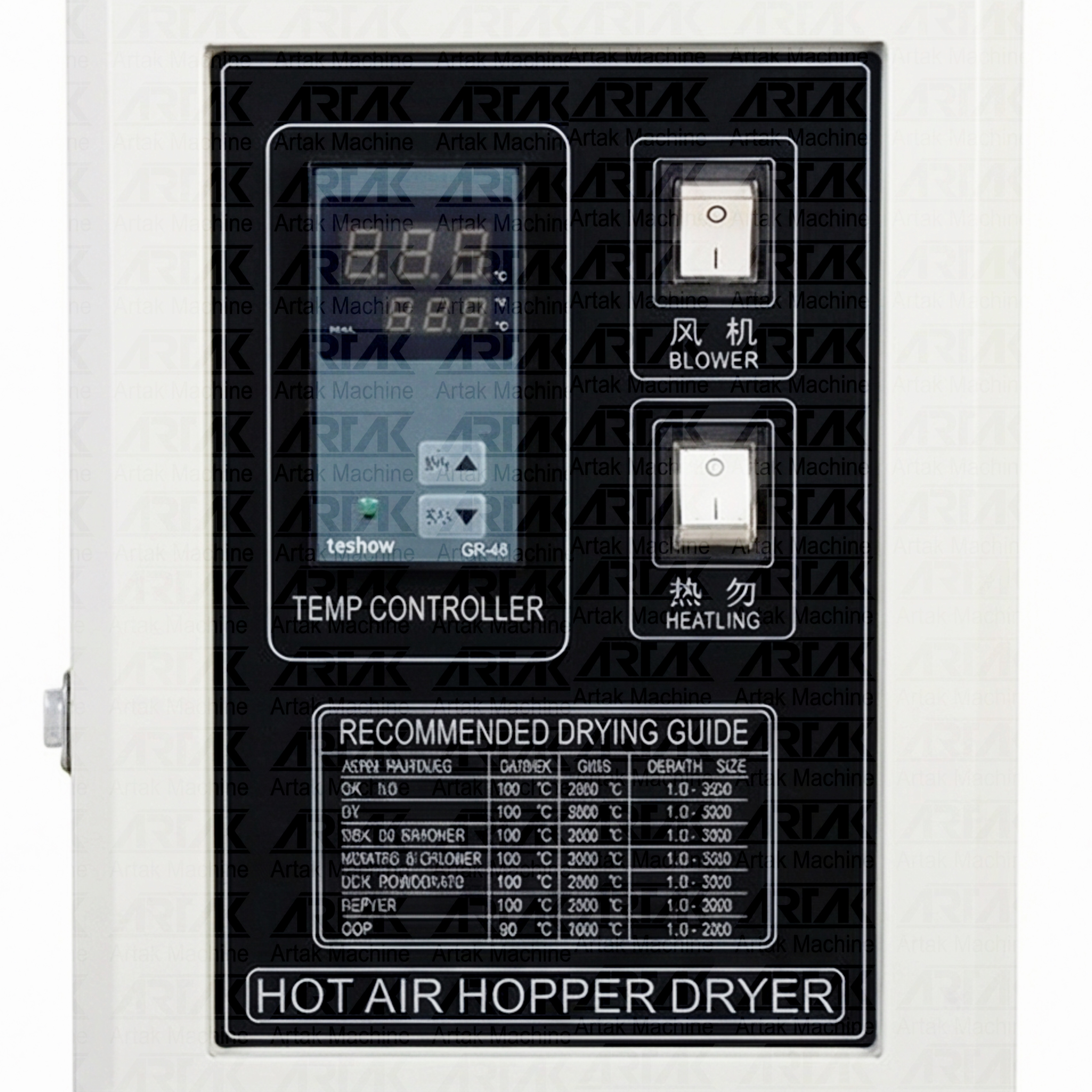 ساخت کشور چین برند سوپرسان (NBT) کــیفیت بســیار عـــالی مناسب برای دستگاه های تزریق و اکسترودر اتصالات ساخته شده از فولاد ضدزنگ. جدارهی آلومینیومیِ با دقت قالبگیری شده با سطح نرم و همچنین قادر به حفظ دما. برخورداری از دمنده کمصدا به همراه فیلتر تصفیه اختیاری بنا به درخواست مشتری. دارای دریچهی کناری شیشهای روی مخزن مواد جهت نظارت بر چگونگی عملکرد دستگاه. دارای مدلهای قابل سفارش 50 تا 1500 کیلوگرمیِ حرارت بالا، مجهز به مخزن دوجداره، تیوب گرمایش از جنس فولاد ضدزنگ و دمندهی حرارت بالا. طراحی قیف به گونهای است که بازکردن آن را تسهیل و نیز آن را برای ارتباط با انواع رباتها مناسب میسازد. مناسب برای استفاده در دستگاه های تزریق پلاستیک و اکسترودر.